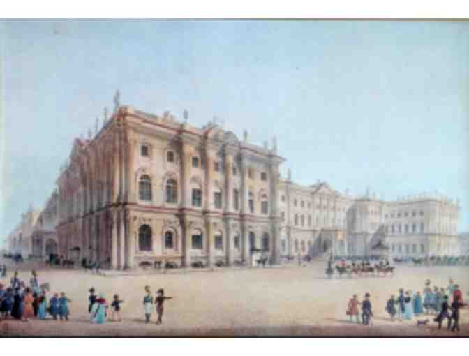 A rare print of the Winter Palace in St. Petersburg long before it became the Hermitage. On the top of the print are the Russian words which mean “Winter Palace from the side of the admiralty.”