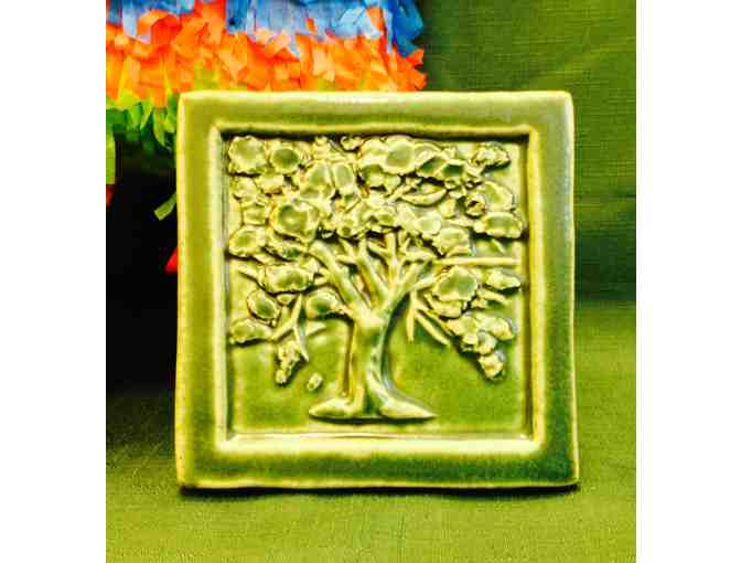 This 6"x 6" high-sculpted relief tile features a solitary oak tree, a symbol for strength, planting roots, and growth. The tile was designed and created in the late 1980's by artist Troy Walker, a lovely addition to anyone's home or workplace.