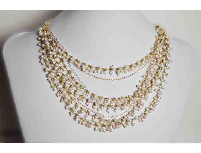 One-of-a-kind necklace made in New York City entirely by hand from hundreds of tiny freshwater pearls by Kiley Durham Jewelry & Design. Five strands of pearl clusters are linked by hand to create a layered effect, while delicate silver and gold chains add luster. A simple hook closure at the back allows for length adjustment to ensure a perfect fit with every outfit. This single-edition piece was designed especially for the Midtown West Auction.