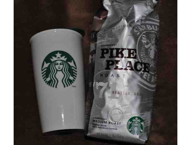 A Starbucks ceramic travel coffee mug and one pound of Pike Place Roast (Medium Roast) coffee.