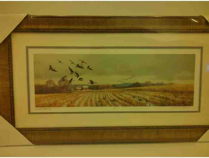 G. Lubech: Signed Print of Winter Gathering: Ducks on Cornfield