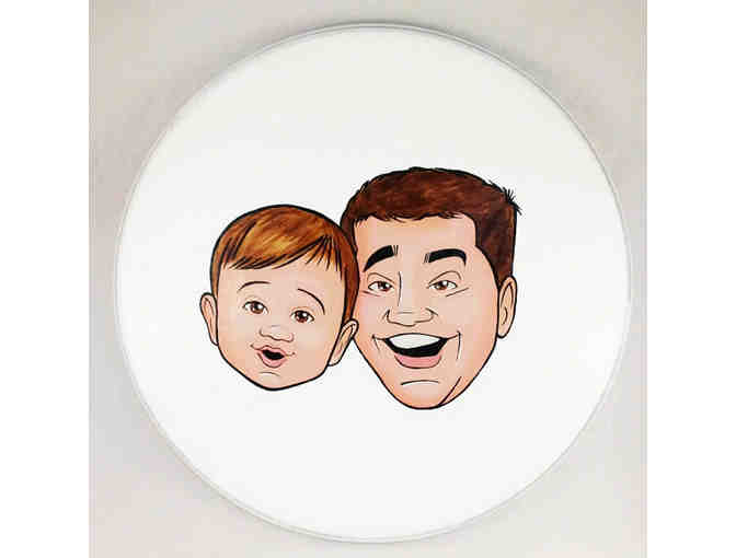 From the website: Percussionists run in the family so when we were asked by a client to create an original caricature art piece on a drum head we jumped at the chance! This drum head measures 14" in diameter and is hand painted in acrylic with the caricature of a father and son.