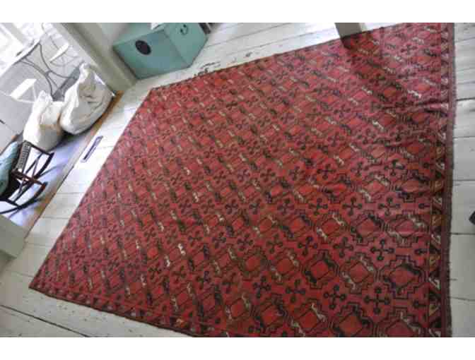 This large Turkish rug was imported upon a visit to Istanbul from an antique rug dealer. The age of the rug is unknown. It is in mint condition, used briefly in the donor's vacation home. It has deep burnt umber tones with navy and off white detailed geometric patterns woven in that are reminiscent of an Aztec theme. Texturally the fabric is a fine, tight weave with a rich looking patina that shows some color variance that speaks to the authenticity of an antique.