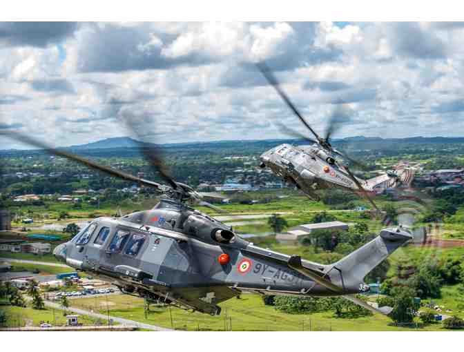 16x20 limited edition "Yank and Bank" signed, framed print of Agusta Westland AW139's in formation over Port of Spain, Trinidad & Tobago. Frame is high quality wood and can be delivered in White, Light wood (no stain), dark wood (Mahogany color) or Black.