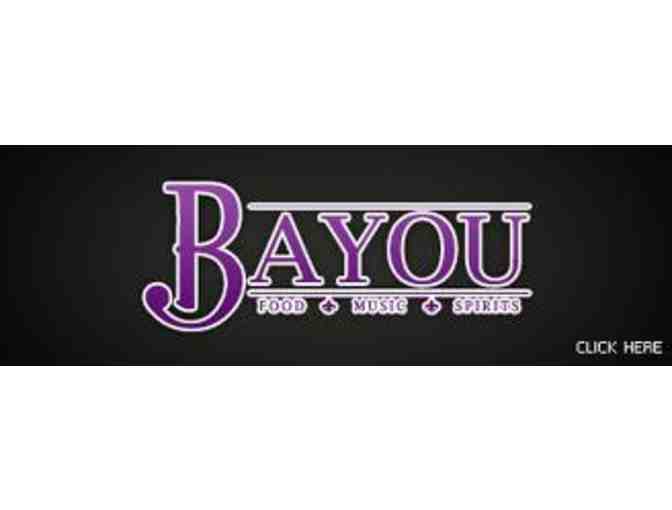 With this gift certificate for dinner for two (2) at Bayou, you and your guest will each choose an appetizer, entree, dessert, and signature cocktail.