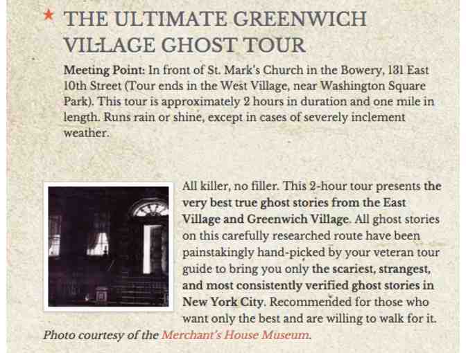 2 tickets for Macabre New York City walking tours. Tour choices include The Ultimate Greenwich Village Ghost Tour; The Magic and Mysticism of Central Park; The Weird West Village: From Poe to Lovecraft; Poe's Greenwich Village; Forgotten Dark Histories of Lower Manhattan; Murder, Scandal, and Vice; Ghosts of Christmas Past; Ghosts of the Titanic; Green-Wood Cemetery; and Haunted Brooklyn Heights
