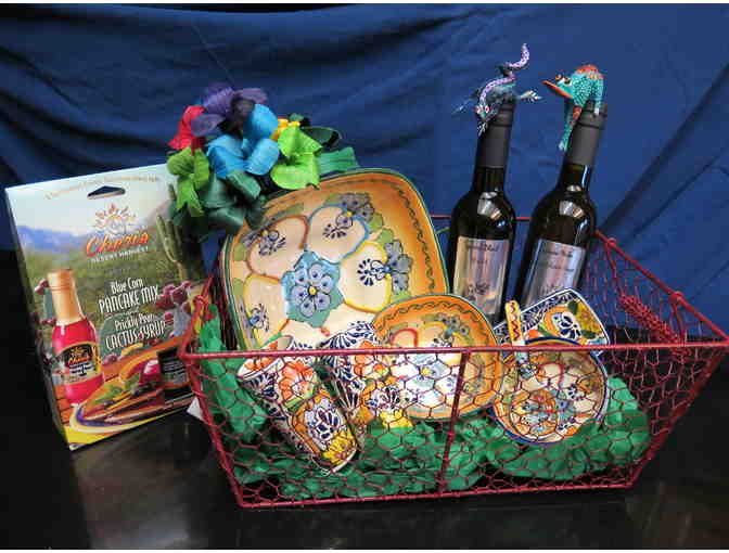 The Tubac & Talavera basket is filled with bottles of Spanish Olive Oil and Cucumber Melon flavored white balsamic vinegar, an assortment of Talavera pottery, a corn husk flower bouquet, two whimsical Oaxacan figurines, and a Blue Corn Pancake Mix with Prickly Pear Cactus syrup.