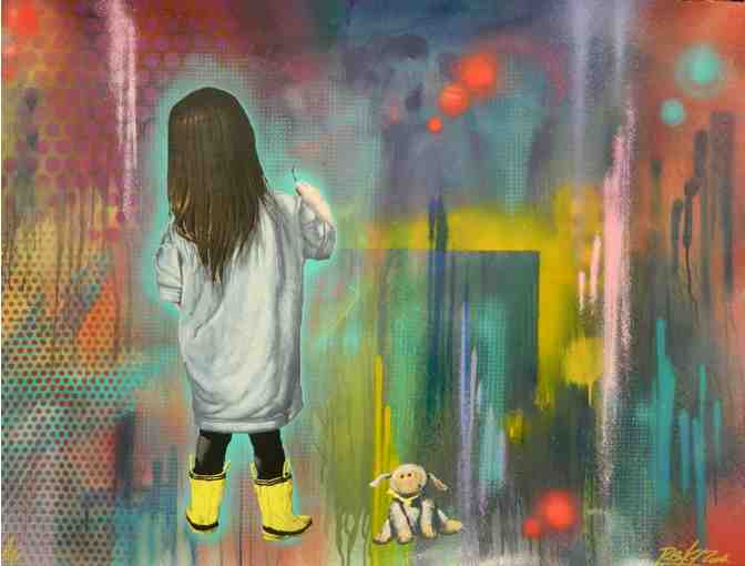 Recreation of a photograph of the artist's daughter in his studio. The artist was captivated by the image and has since re-created it on an original painting and mural in Los Angeles. It captivates the moment innocent scribbling becomes an important transcendental journey through art. It is hand painted by Risk in his trademark style. The image of his daughter "Stormey" is silkscreened with 17 colors. Hand finished with tinted gloss lacquer and metal flake. The painting is signed and numbered by the artist and painted on 450gsm Cotton Coventry Rag archival paper.