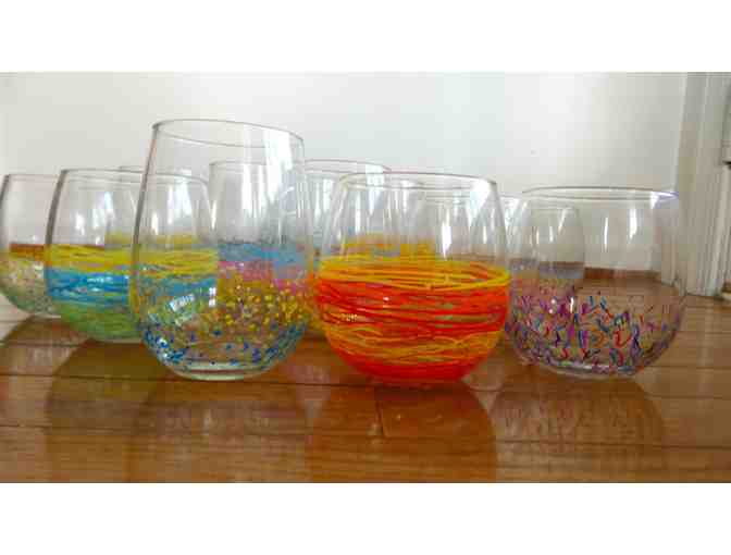 What a great addition these hand-painted glasses would be to any kitchen! Use these stemless wine glasses decorated by the 2nd graders for red and white wines, for that morning glass of juice, or just for a fun glass of water!