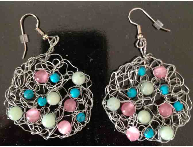 One of a kind crocheted wire earrings (no two pair of earrings alike) with a combination of stones--vintage jade, Swarovski crystals, and turquoise made by Stephanie Sloane, "Designed For You".