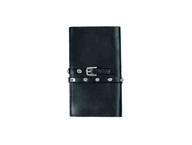 Travel Wallet from "Coiled" collection, with a belt buckle that achieves to give to the piece a "coiled" touch. Composed by six card cases and a purse. Black color. 100% handmade with cowhide and cotton. Measures: 19 cm width x 11 cm high.