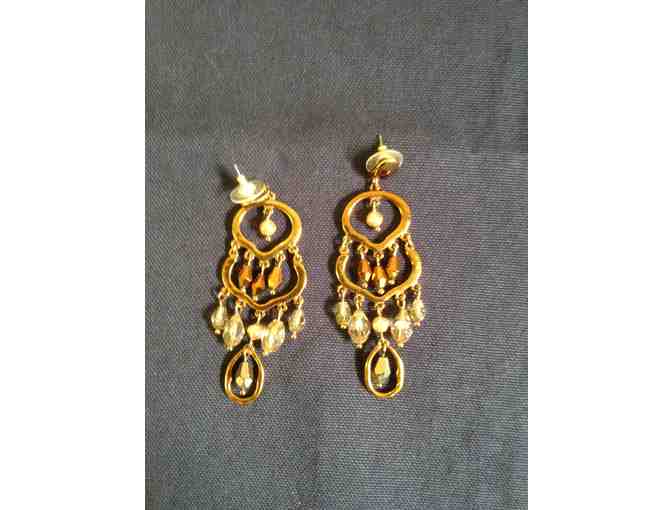 Chico's Chandelier Earrings. 2 1/2 inches long. Hypo-allergenic. Gold-toned costume jewellry from Chico's. They keep up with the current fashion trends. Perfect complement to one of the long necklaces!