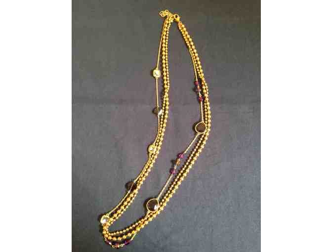 This 34" 3-strand drop necklace with small pearl-like beads and purple glass stone accents will pair beautifully with the chandelier earrings! Chico's costume jewelry is always in fashion!