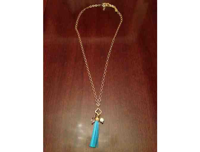 You are bidding on a beautiful clover pendant on a 40" matte gold toned chain that can adjust to any smaller length. Charms on clover include a leather aqua tassel, glass crystal, and fresh water pearl. Swarovski crystal on extension chain with lobster clasp.