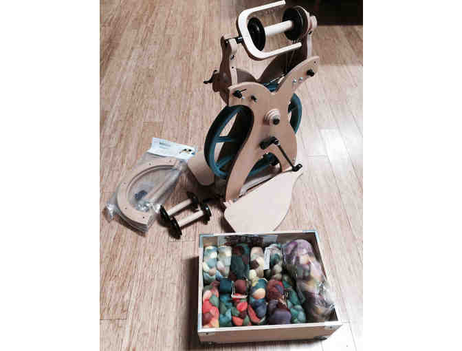 A barely used Schacht Sidekick plus a box of hand dyed roving samples! The wheel folds up for easy transporting, then unfolds for an easy and satisfying spinning expereince! Includes 3 bobbins and a lazy susan, and the box of wool roving. Over $800 new!