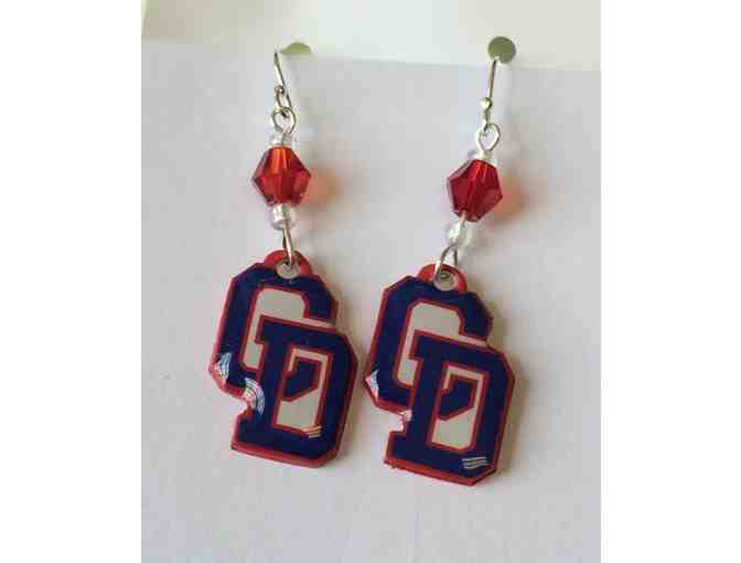 Hand made sterling silver earrings with CD logo pendant, and glass red Swarovski crystals. Original made by Sheila Pace.