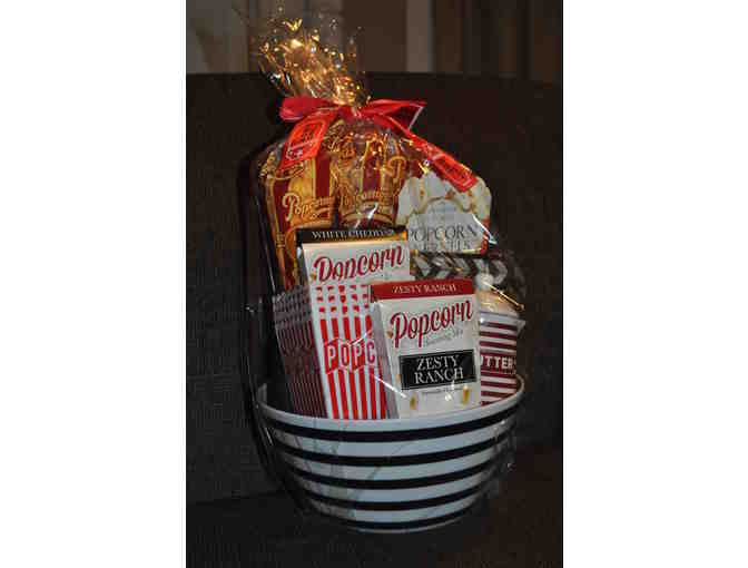 Plastic popcorn bowl, popcorn sleeves, butter pitcher, microwave popcorn, ranch seasoning, popcorn kernels, cheese popcorn and caramel corn.