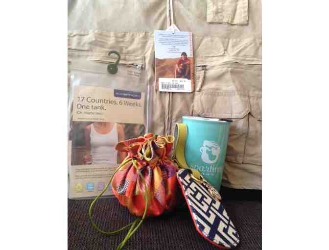 An incredible travel package: Spartina coffee mug; Spartina luggage tag ,Ex Officio vest, Ex Officio large tank; Cathayana jewel pouch.