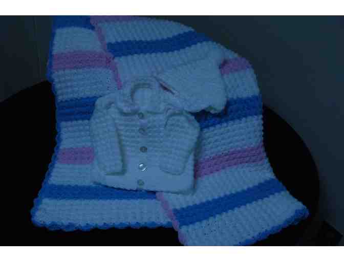 Beautiful Crocheted White Baby Sweater, Hat and Blanket by former CCHS parent Chris Olsen