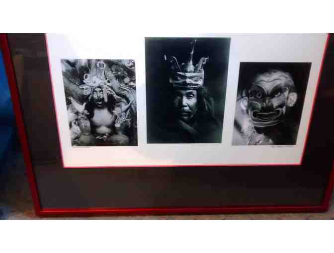 Joel Rogers, author of Watertrail, the Hidden Path through Puget Sound, printed three portraits from the Library of Congress collection of The North American Indian: Volume 10 the Kwakiutl, by Edward S. Curtis (1868-1952). J.P. Morgan had agreed to commission Curtis to produce a twenty volume overview, which was published over the years 1907 to 1930. This composition has three of the many photographs taken by Curtis during his 1910-1914 field sessions. From left to right: Hamatsa emerging from the woods - Koskimo; A Tluwulahu mask - Tswatenok; and Pgwis - Qagyuhl