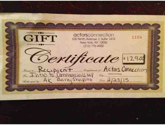 Gift Certificate from Actor's Connection for: Introductory class in commercial technique, a one-day intensive with casting director Barry Shapiro. Actor's Connection is located at 630 9th Avenue Suite 1410 (btwn 44th & 45th) New York, NY 10036 Actor's Connection helps actors meet and audition for industry professionals (including casting directors, agents and managers) through classes, intensives, question & answer sessions and special events. Barry Shapiro is the Owner of Herman & Lipson Casting. He has been with Herman & Lipson for over 32 years casting over 8000 commercials, both voiceover and on camera, for such products as L'Oreal, ESPN, Advil, Verizon and many other top accounts. He casts for commercials all around the world and also casts for film, television and theatre. Recently he cast for the play "Facespace" which was performed at the Midtown International Theatre Festival.