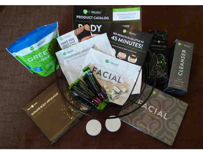 It Works natural health products gift basket includes: 1 body applicator wrap, 1 facial wrap, a 1 oz sample of Cleanser facial wash, a 1 oz sample of Defining Gel contouring gel, 5 samples of berry flavored Greens dietary supplement, and 5 Greens chews. It Works offers a variety of natural health care products in our Body, Skin Care, Lifestyle, and Greens lines. More information can be found at www.ColumbiaRiverWraps.com
