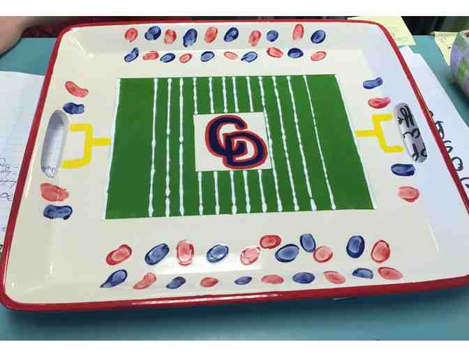 The winning bidder will get CD Football party platter! Help cheer on the team with this adorable ceramic platter painted to depict CD field. The stadium is filled with little fans, that are made from your child's fingerprint.