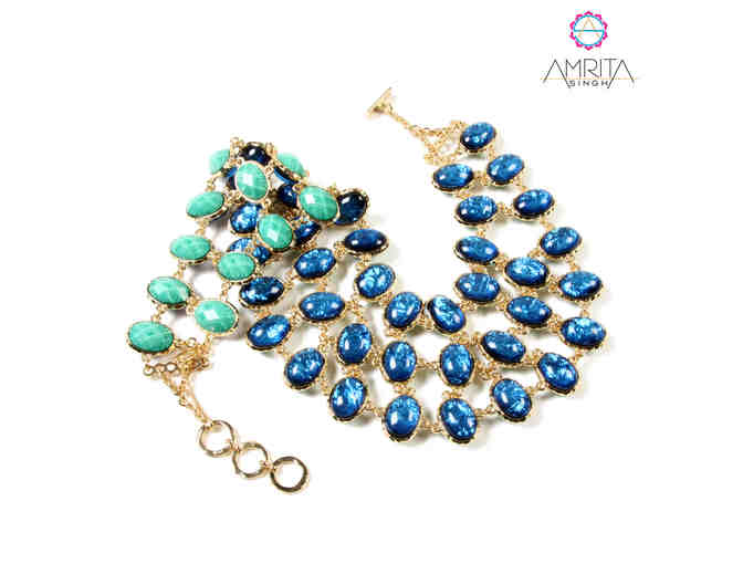 This exclusive Amrita Reversible Bib Necklace in Turquoise and Blue proves bigger is always better with its stellar, eye-catching stones and two-in-one color choice. A surefire attention grabber and conversation starter, everyone will want to know where to find your double-sided neck candy!