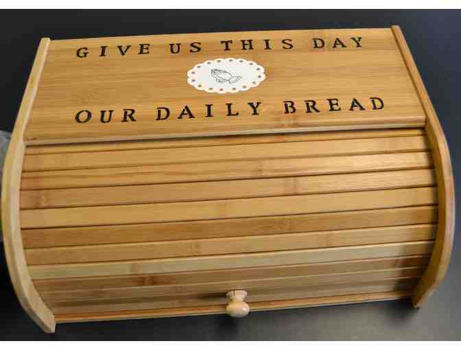 This breadbox was hand stenciled by each 4th grade student "Give Us This Day Our Daily Bread". Includes a photograph of teh entire 4th grade class as well as a kitchen gift basket.