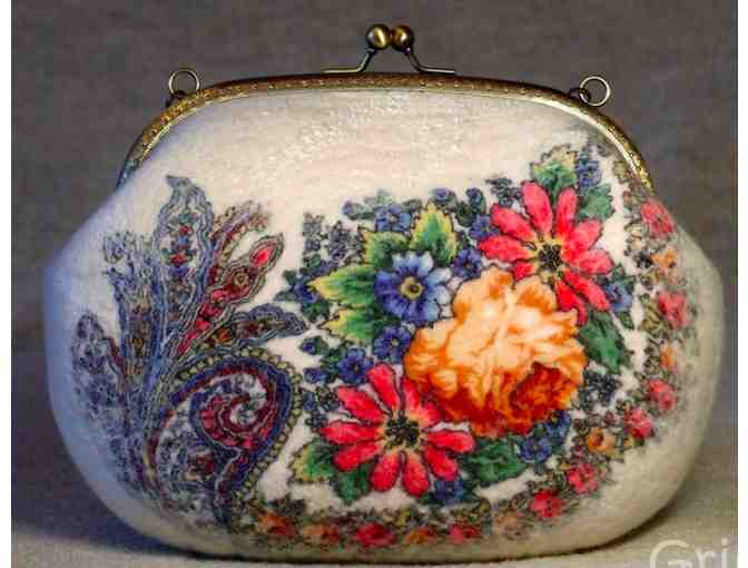 A gorgeous felted women's purse handcrafted in Ukraine. Materials used: Wool, Silk and Viscosa Fibers, a fragment of a gorgeous Pavlovo-Posadskie Shawl. Comes with a coin purse.