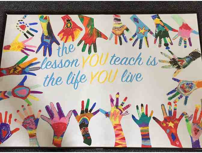A true treasure from Ms. Donaldson's class, each student lent a hand with pastels and paper to create this framed work and saying, "The lesson you teach is the life you live"