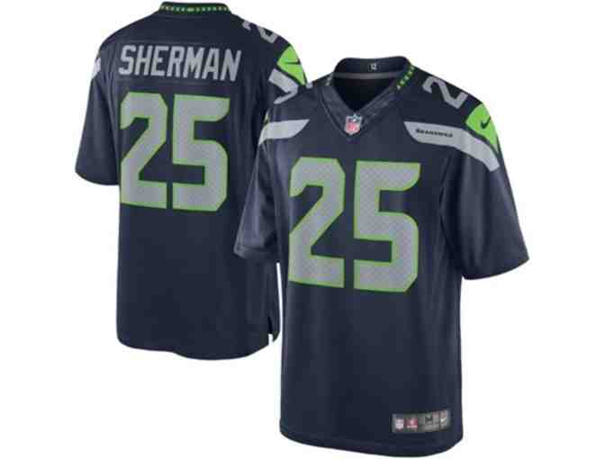 Score this Men's Large Seattle Seahawks Jersey representing Sherman #25!