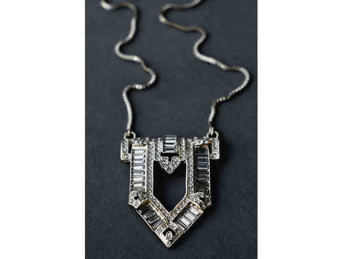 This pendant necklace, designed by Sequin in New York City, features sharp geometric shapes.  Reflecting the shape and shimmer of the opulent Jazz Age era, it is the only accessory required for the ultimate individual style statement at Going Gatsby.