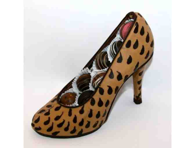 This luscious Enjou Chocolat high heel shoe is guaranteed to make a sweet impression on your Mom or that special woman in your life! Chocolate pump hand-designed with a beautiful leopard print pattern and filled with assorted Enjou truffles. (Truffles may include hazelnut, raspberry, rum, mocha, caramel, chocolate, butter pecan, cappuccino and more.) Guaranteed to impress even the most serious chocolate lover. This irresistible gift item is 7 inches high and comes in a white box wrapped with a beautiful plum-colored bow.