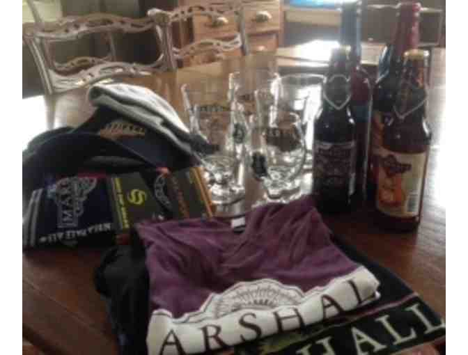 Amazing items from Marshall Brewing: beanies, sport socks, t-shirts, water bottle, pint glasses, small glasses, ball cap, Glory Bourbon Barrel Aged Belgian Style, Dolphin Imperial Stout, This Machine IPA and El CuCuy Indian Style Black Ale.