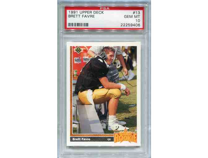 A nearly perfect example of the 1991 Upper Deck Brett Favre #13 rookie card in PSA 10 GEM MT condition with great centering, color, corners and gloss.