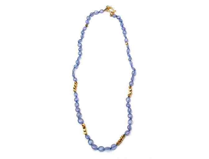 From award winning designer Marya Dobrowski, necklace of cabochon tanzanite beads, interspersed with 18K gold beads, 16” long.