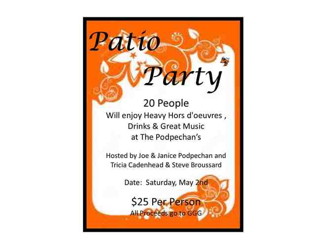 Twenty people are invited to a patio party at the Podpechan home featuring heavy hors d'euvres, adult beverages and Karaoke with Steve Broussard on Saturday, May 2, 2015.