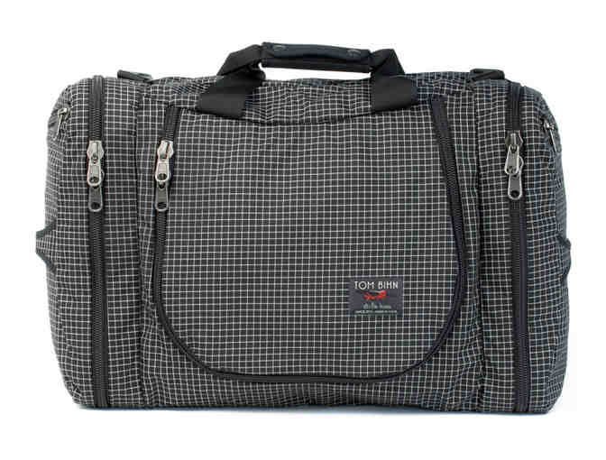 The Black Dyneema/Ultraviolet Dyneema Aeronaut 45 travel bag by TOM BIHN is designed to qualify as a maximum-size airline carry-on bag. It can be carried as a backpack (with its zip-away backpack straps), or with its padded handle can be carried on-edge as one would a traditional suitcase. The main body of the bag is divided into three significant compartments via two zippered dividers: a large center compartment is flanked on both ends by substantial end pockets. These end pockets can easily accommodate size 12 running shoes (now maybe you can finally take all the shoes you need with you.
