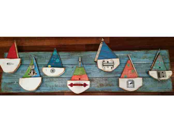 42x11- Sailboats made of recycled wood and hardware attached to a turquoise wooden plank. Features painted colors of blues, green, and reds.