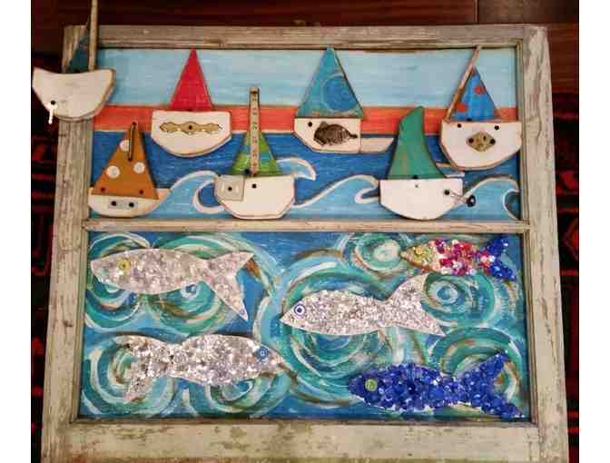 33x30- Wooden framed canvas of a playful painted ocean with embellished wooden fish and sailboats made of recycled wood and hardware attached. This is a fun and colorful piece.