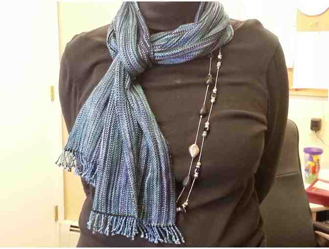This soft 9" x 72" scarf was handwoven by puppy raiser Bonnie Moore from a variegated rayon yarn. It includes shades of blue, green and black, and has a short, twisted fringe on each end.