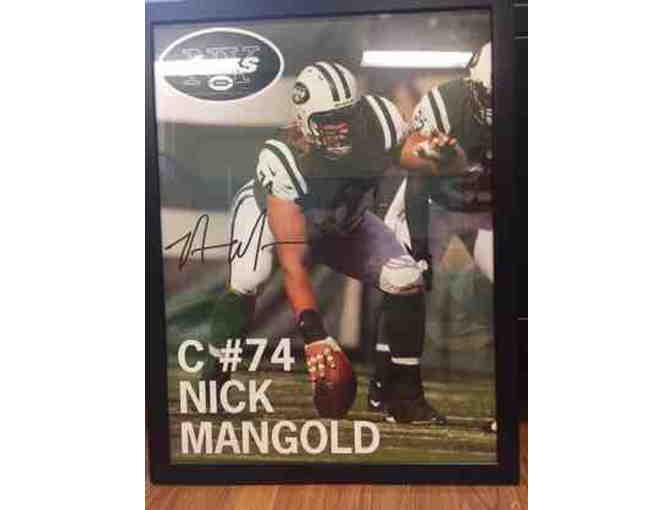 Replica lithograph autographed and framed poster featuring 5-time Pro Bowler and 3-time All-Pro center Nick Mangold. This poster is made in limited quantity by the Jets and not sold in stores.