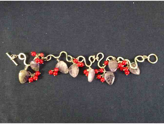 Silver bracelet with lavender stone leaves and red beads. 7 1/2" long.