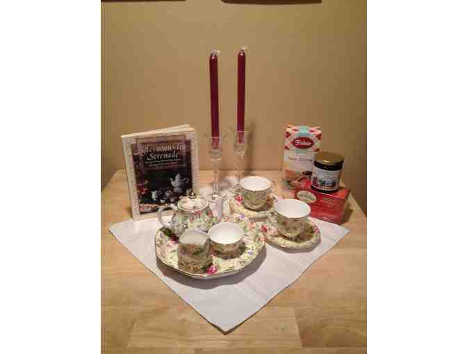 An Afternoon English Tea includes: English Staffordshire bone china tea set, scone mix, Twinings English Tea Breakfast tea, strawberry jam, (2) crystal candlesticks with (2) burgundy candles, and Afternoon Tea cookbook.