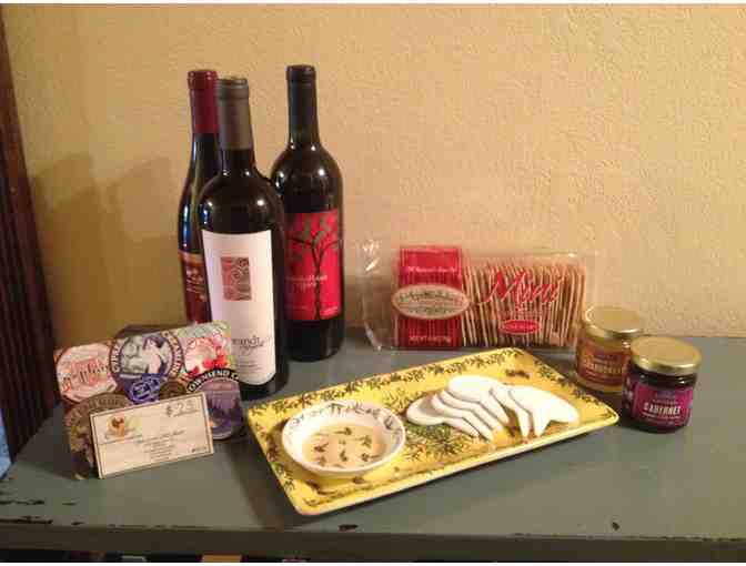 A Night of Wine and Cheese includes: a bottle of 2010 Millbrandt Malbec, 2010 Wapato Point Cellars Malbec, 1998 Columbia Crest Reserve Syrah, $25 Cheese Louise gift card, Mary Hughes plate and dipping bowl, (6) ceramic markers with pen for cheese, La Panzenella crackers, cabernet and chardonnay artisan cheese topping.
