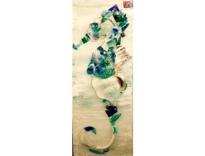 16x40 painted canvas with stained and crushed glass flowers to form the appearance of a beautiful Seahorse. Featuring shades of blues and greens.