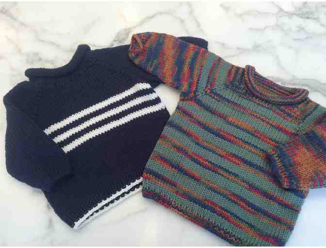 One very lucky baby boy will receive two adorable rolled collar pullovers; a navy blue-and-white striped and an autumn-colored one. Two perfect treasures for keeping away that winter chill. Hand-knitted by La Entrada's very own Leanne Cummins!