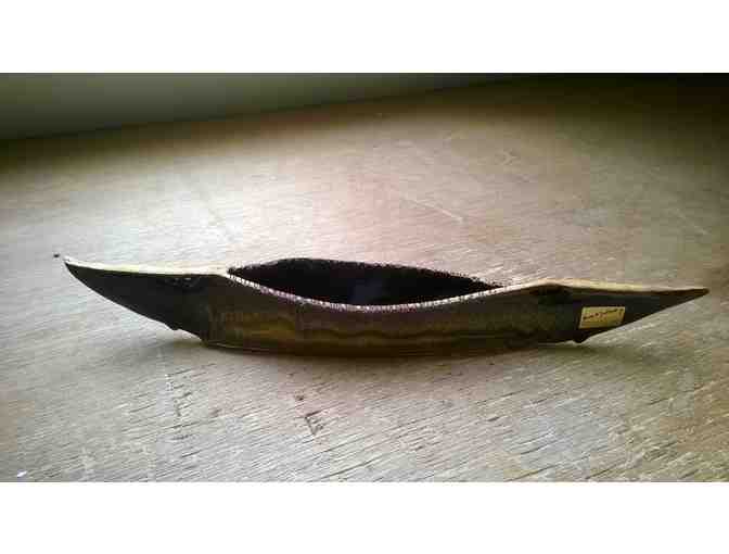 Louis Mulcahy's workshop is based outside Dingle, County Kerry on Ireland's Wild Atlantic Way. Since 1975 when he opened his pottery shop, his vision has been to produce the aesthetically and technically best pottery possible and develop a studio/workshop which would leave an indelible print on the long term history of Irish handcraft. This unique ceramic  boat, otherwise known as Currachs, is an Irish  boat to which the construction and design is unique to the west coasts of Ireland and Scotland. Dimensions are 2.2 inches high by 18 inches long.