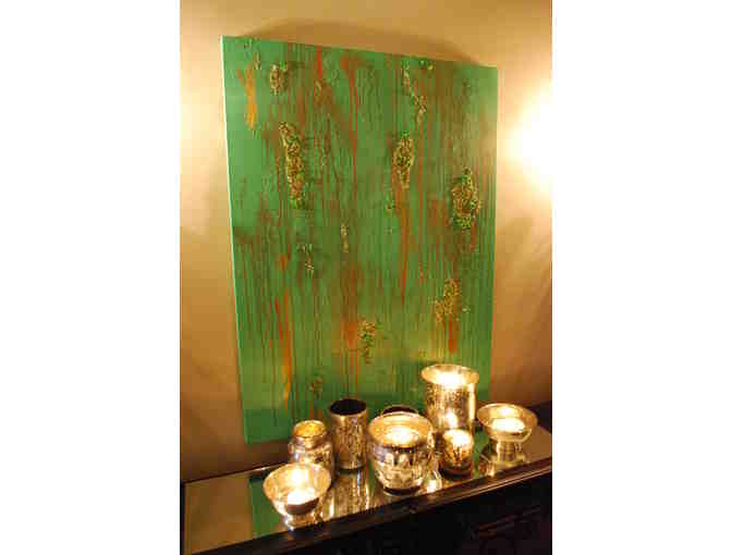 This original artwork was created by the students in Ms. Sherri's class. The artwork was made by applying oxidizing copper metal and water based paint to a green canvas.  The canvas was the target as each student climbed a step ladder to shoot a paint gun to mark his or her spot. As you can imagine, the children loved making this! Afterward, copper metal leaf and sea glass (in shades of verdigris and copper) were applied.